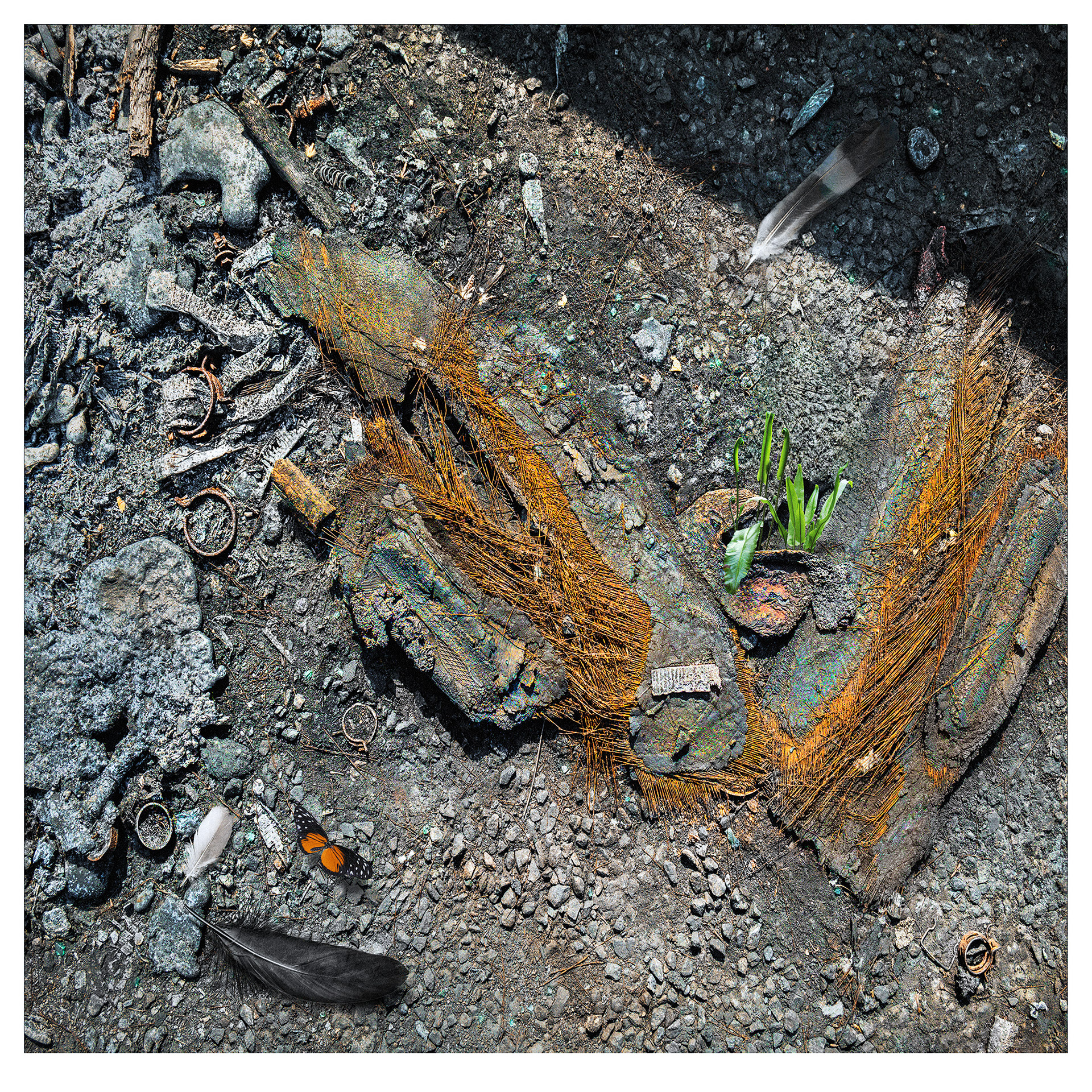 I attribute credit for the pieces here to Nature. I draw inspiration from the erosions, stains, etchings and crumblings on walls and surfaces. In these textures, I see environmental and social issues as messages in landscapes; it is serendipity and pareidolia at work